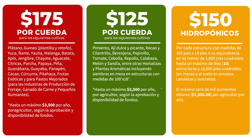 El programa incluye ayudas directas para la producción agrícola mediante vales para fertilizantes bajo el componente de técnicas de precisión agrícola. Los montos varían según el cultivo, con incentivos por cuerda sembrada y un tope anual por agricultor.