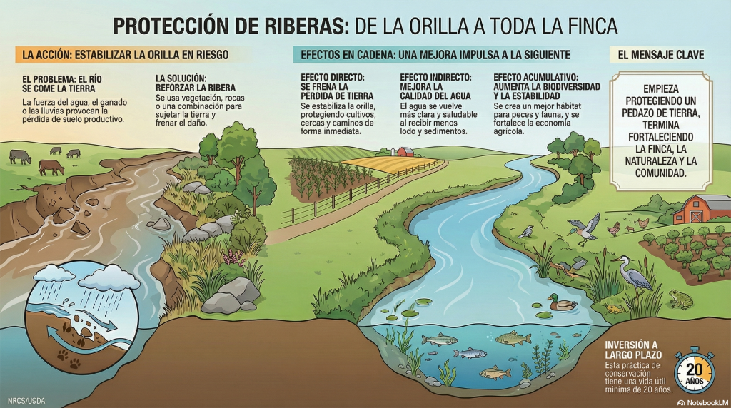 Esta práctica de conservación, avalada por el Servicio Nacional de Conservación de Recursos Naturales (NRCS), bajo el código 580 busca estabilizar las orillas de ríos, quebradas, lagos y canales, especialmente en zonas donde el agua, los sedimentos, el ganado o incluso el paso de personas y vehículos provocan erosión constante.