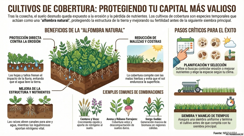 Los cultivos de cobertura ofrecen una forma práctica de cuidar ese recurso entre cosechas. Cuando se integran bien en la rotación, ayudan a reducir pérdidas hoy y a mantener un suelo más sano para las próximas temporadas.