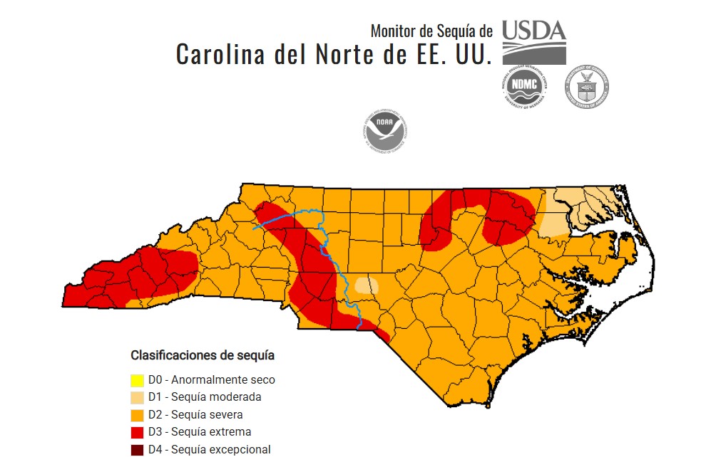 Treinta condados enfrentan condiciones de sequía extrema, mientras la mayoría del estado lidia con niveles severos o moderados, según el Consejo Asesor para la Gestión de la Sequía de Carolina del Norte (DMAC).